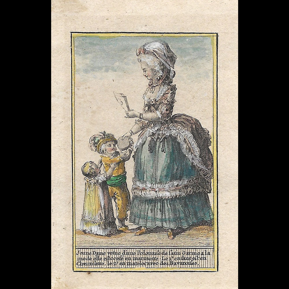 Elles portent les titres suivants : "Dame affublée d'un domino de taftas à capuche en usage aux Bals", "Jeune dame vêtue d'une polonaise de satin garnie à la mode, elle est coefé en marmotte. Le 1er enfant est en chemisette; le 2e en matelot avec des bavaroises", "Jeune Dame vêtue d'un frac à bavaroise et la Jupe. Coeffée d'un chapeau à plumes" et "Dame en pelisse de satin fourrée, manchon blanc et affublée d'une Thérèse."