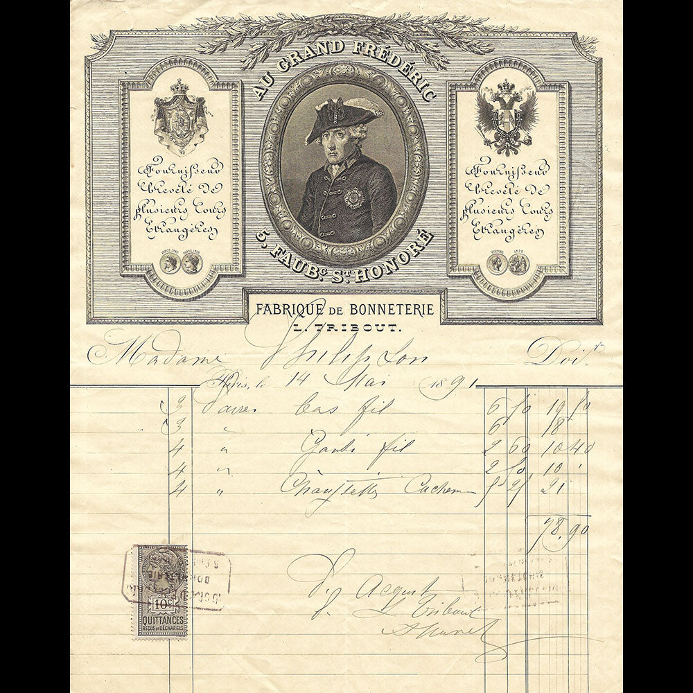 Bon exemplaire d'une facture de 1891 de la fabrique de bonneterie Au Grand Frédéric située 5 Faubourg Saint-Honoré à Paris.