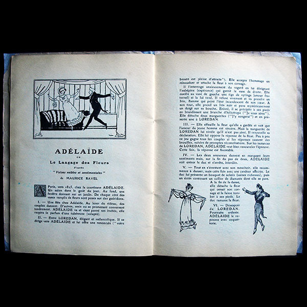 Programme des quatre concerts donnés en 1912 par la danseuse Natalia Trouhanowa. Les pièces représentées sont La Péri de Paul Dukas, Istar de Vincent d'Indy, La Tragédie de Salomé de Florent Schmitt, et Adélaïde ou le Langage des fleurs de Maurice Ravel. Ce programme est une production luxueuse de l'imprimerie Maquet qui contient notamment 4 planches au pochoir d'après des compositions des décorateurs du spectacle René Piot, Georges Desvallières, Maxime Dethomas et Drésa. La couverture est de René Piot.
