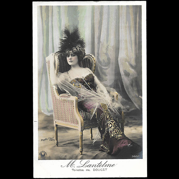 Bon exemplaire d'une carte postale représentant la comedienne Geneviève Lantelme portant une robe de la maison de couture Doucet. Cette carte est une version colorisée d'une photographie du studio Felix.
