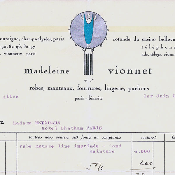 Vionnet - Facture, 50 avenue Montaigne à Paris (1er juin 1928)
