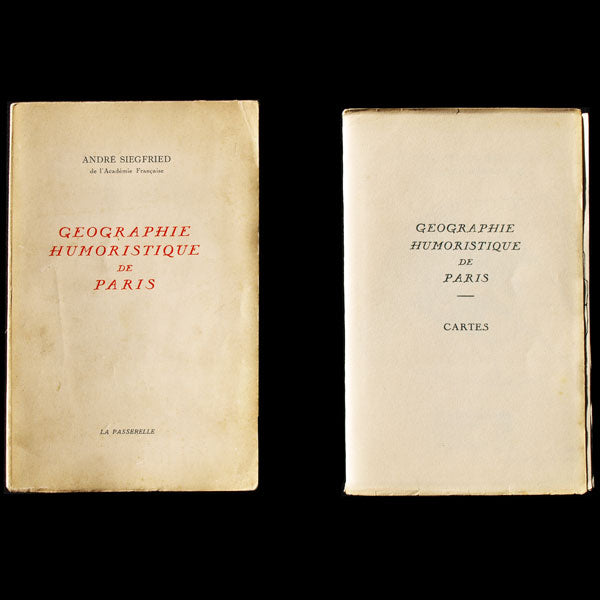Bon exemplaire de ce livre dans lequel André Siegfried dresse une géographie humoristique de Paris. Amusant ouvrage par celui qui fut titulaire de la chaire de géographie économique et politique du Collège de France. Académicien, André Siegfried fut également le président de la Fondation Nationale des Sciences-Politiques. Il enseignait à Sciences-Po lorsque Christian Dior y étudiait. Cet exemplaire comporte un envoi autographe de l'académicien au couturier : 'A M. Christian Dior qui se situe au centre de gravité de ce que Paris a de plus parisien.'