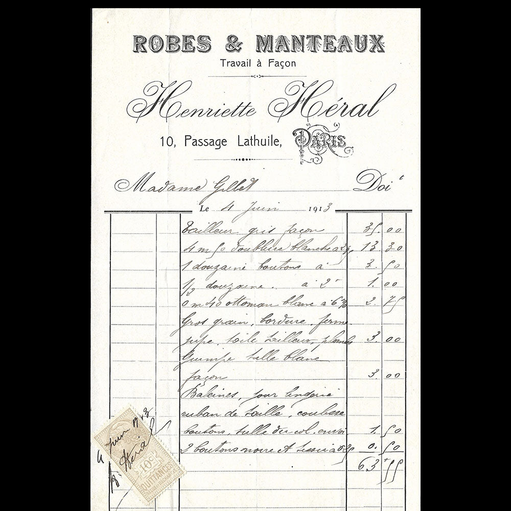 Bon exemplaire d'une facture de 1913 de la maison de couture Henriette Héral située 10 Passage Lathuile à Paris.