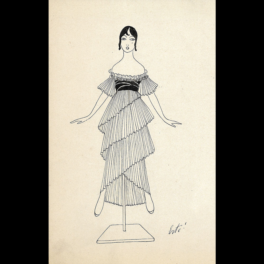 Rare dessin à l'encre de Chine d'Erté pour Paul Poiret. Le modèle est représenté sur un mannequin. Ce dessin date de 1913, l'année de l'arrivée d'Erté dans l'équipe du couturier. Erté choisit un modèle similaire utilisant la même composition pour illustrer ses débuts chez Poiret dans son autobiographie Things I remember parue en 1975.