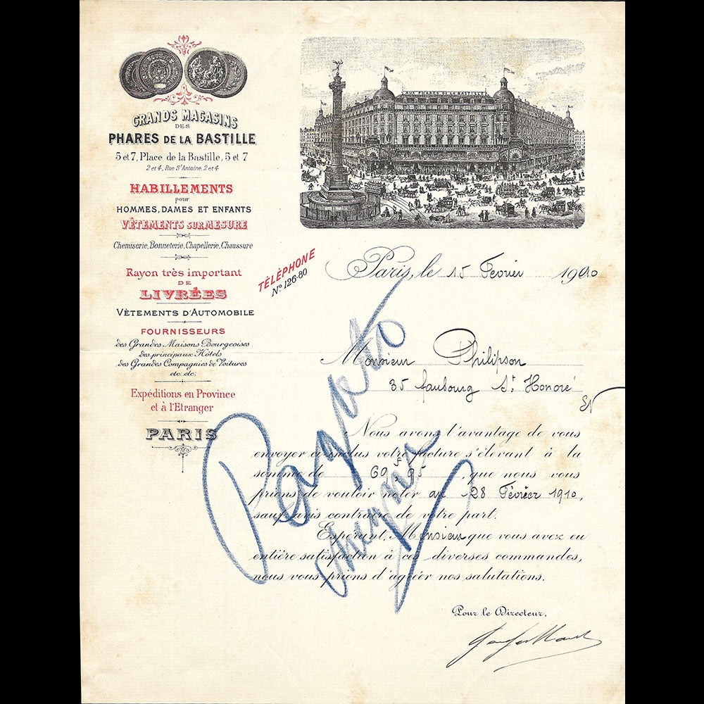 Facture de 1900 des grands magasins Les Phares de Bastille situés 5 et 7 place de la Bastille à Paris.