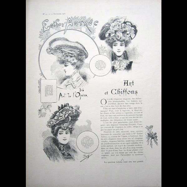 Bon exemplaire du numéro du 10 novembre 1900 de la revue L'Art et la Mode. Cette revue de mode contient 3 dessins signés de Paul Poiret dont 2 illustrent l'article « Art et chiffons » de Frivoline, également illustré de dessins de Lucy et G. de Billy.